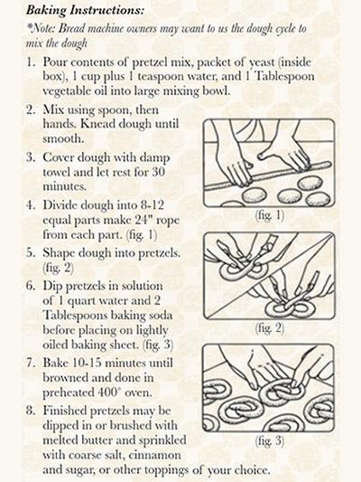 Mix makes: 8-12 pretzels in any shape you choose! (SECRET TIP: IF YOU CAN’T TWIST AND SHOUT: ROLL THE DOUGH OUT WITH A ROLLING PIN AND -- USE A COOKIE CUTTER!!!)